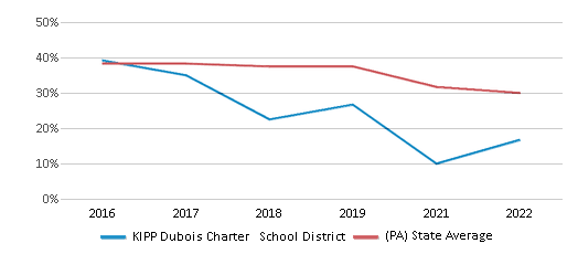 Public School in KIPP Dubois Charter School District have an average math proficiency score of 12% (versus the Pennsylvania public school average of 38%), and reading proficiency score of 42% (versus the 55% statewide average).